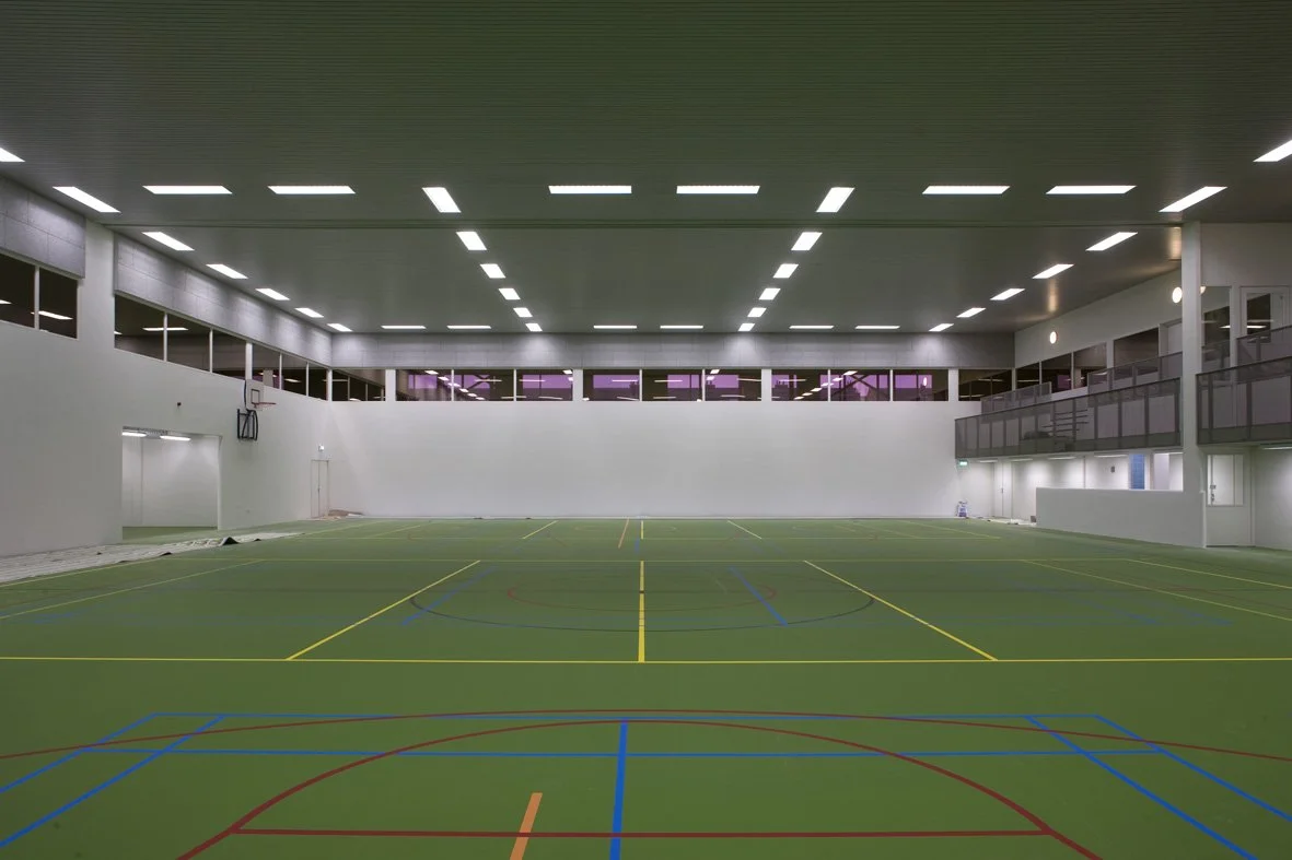 The two schools are situated on the uppermost floor and wrap around the side walls of the sports hall. Its roof is used as a school playground.