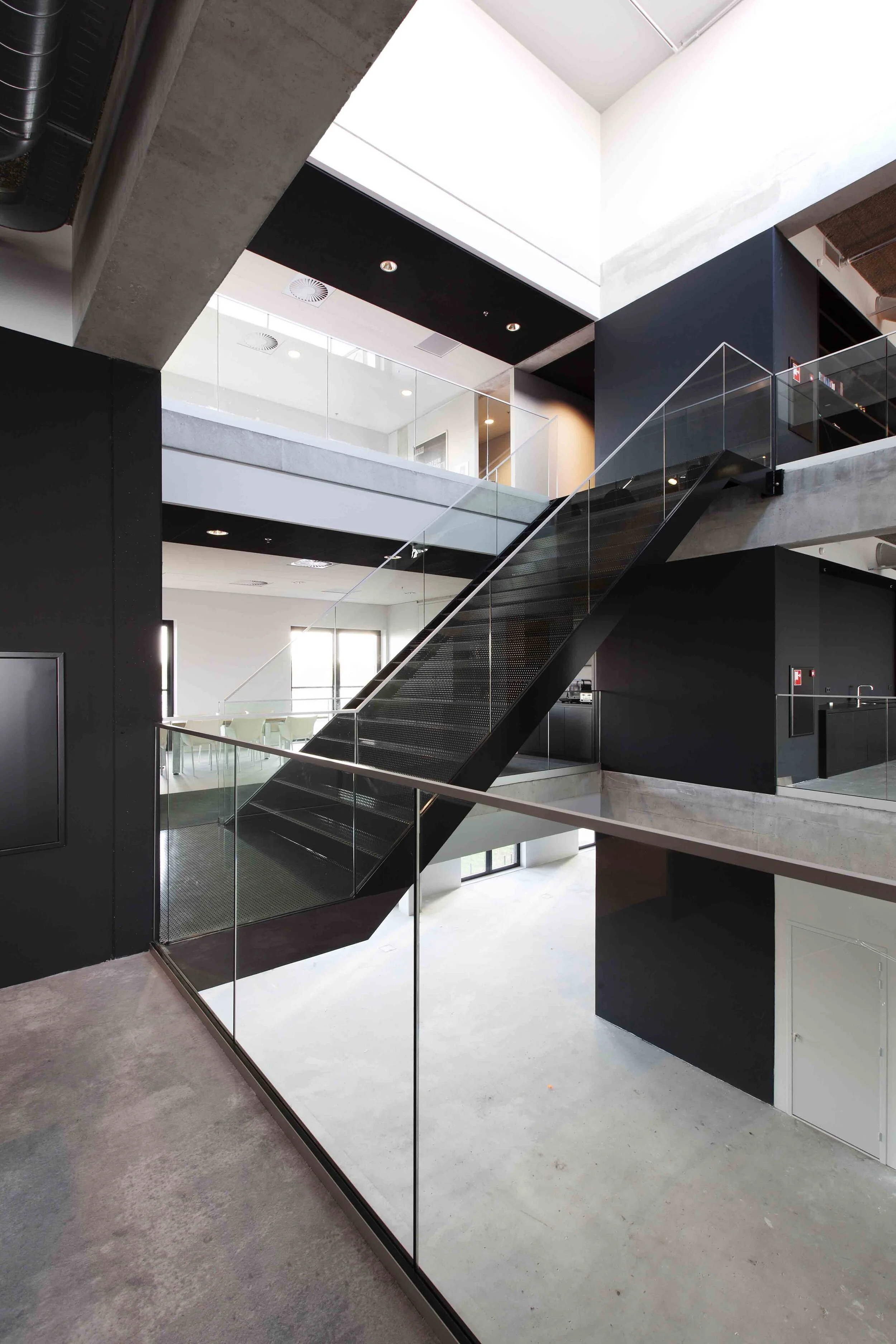 To take full advantage of the view of the dock, the facade facing the water is completely transparent. The large glass windows have been tilted towards the water, to avoid reflections of the glass – a principle also applied in the ship building industry, for the design of the wheelhouse. The south-facing facade is clad in wood, in composition resembling the old warehouses. Designed as an open plan office, with a large central open space, the arrangement of the interior enhances interaction between the users. Taking from the scale and robustness of its industrial predecessors, the new work environment responds to recent insights about creative practice.