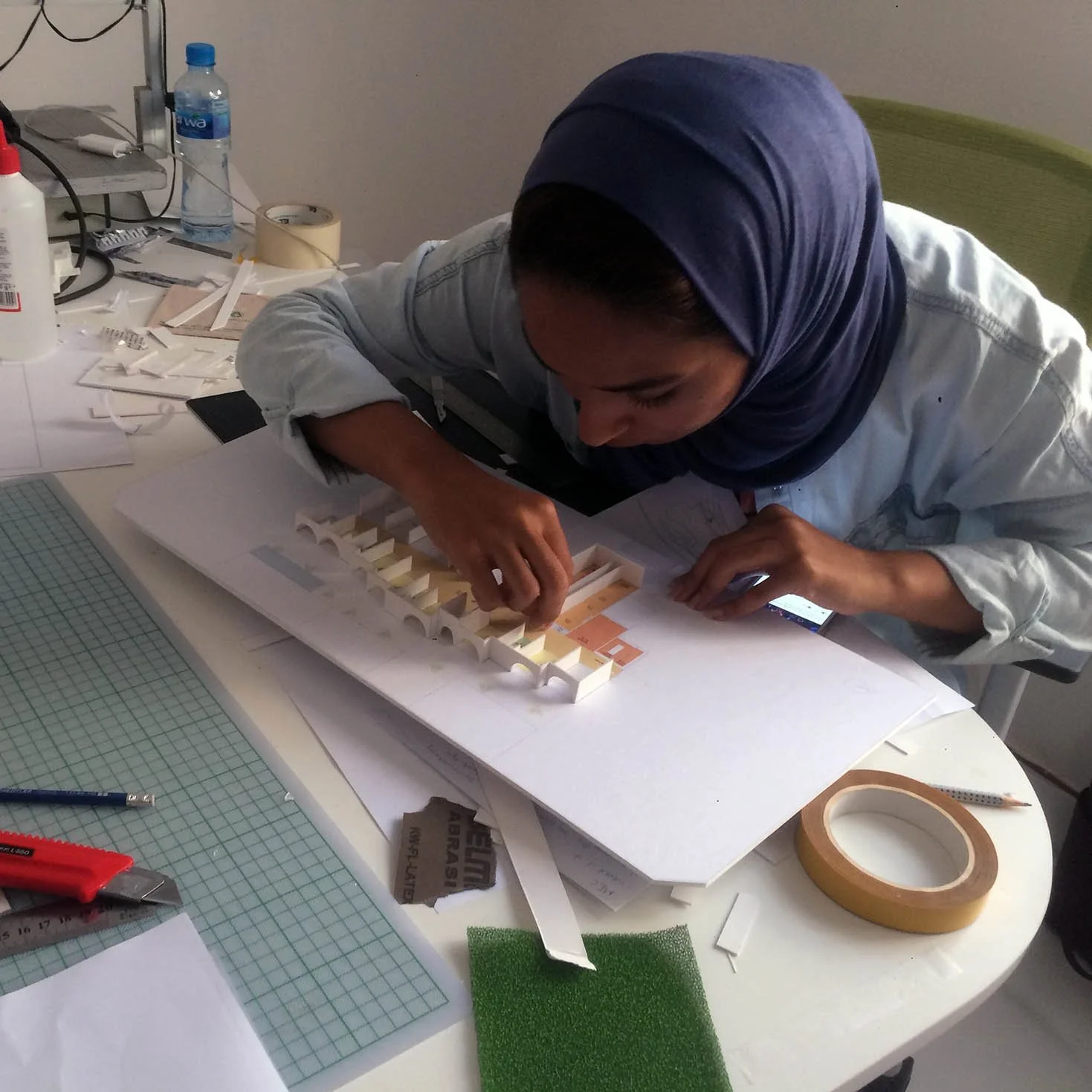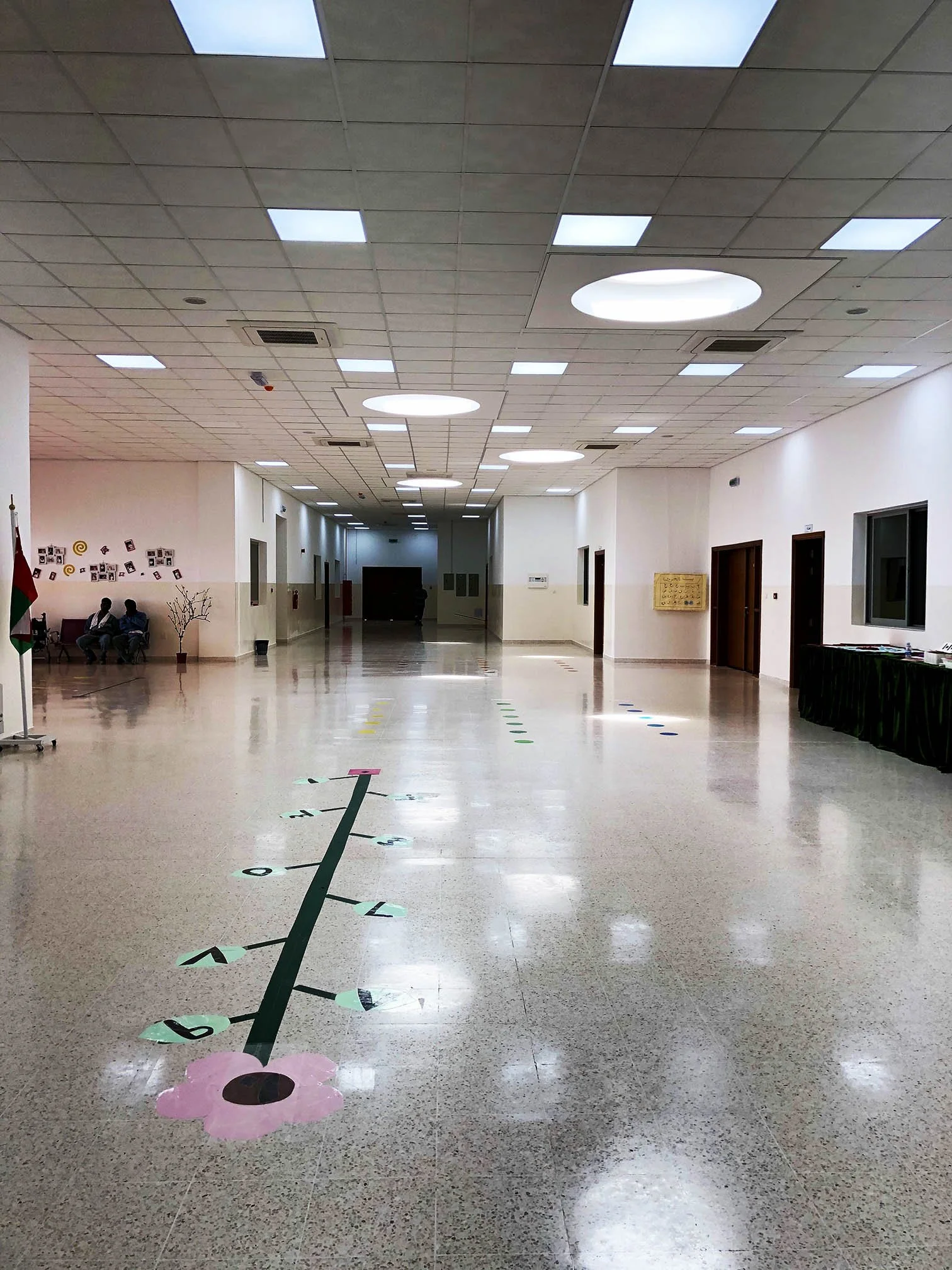 While aimed specifically at children with a disability, all spaces are located on the ground floor. A central hallway gives access to rooms on both sides – the classrooms located to the north, where conditions during school hours are most favourable, and other program to the south. On both ends of the hallway, future expansion is foreseen. To this scheme, a few qualities are added. A gradual widening of the corridor at the centre of the building invites diverse use, and transforms the circulation space into a space of gathering. High ceilings furthermore enhance the feeling of spaciousness. On approaching the building, the bright and colourful composition stands out in its surroundings, aiming to form an appealing environment to the children.